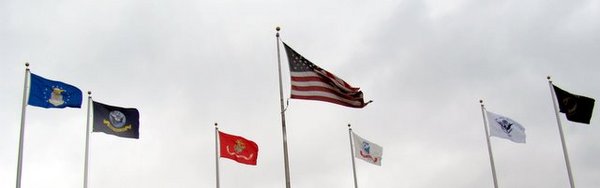 The American flag at the Veterans Memorial has been joined by six flags representing the armed forces and POW/MIA. |