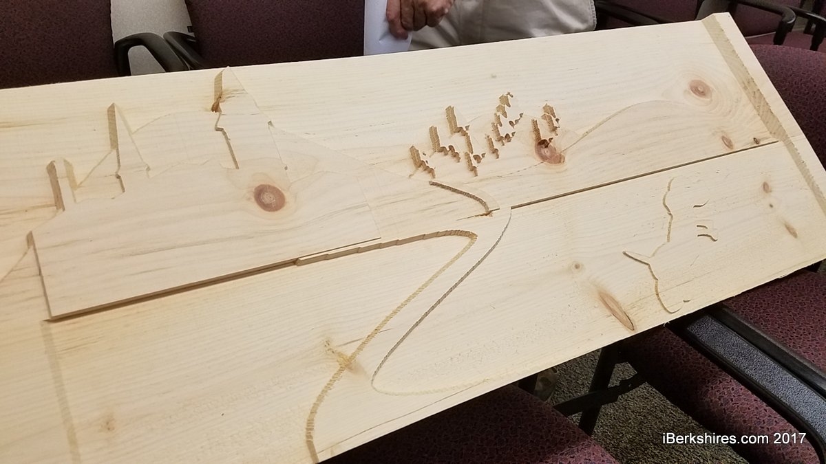 Davis brought a routered wood sample of the sign that when completed will be 38.5 inches by 32 inches. It still had some bugs, he said.