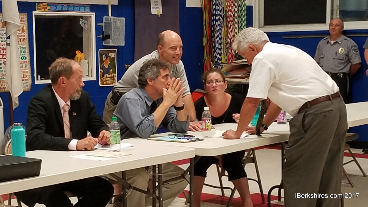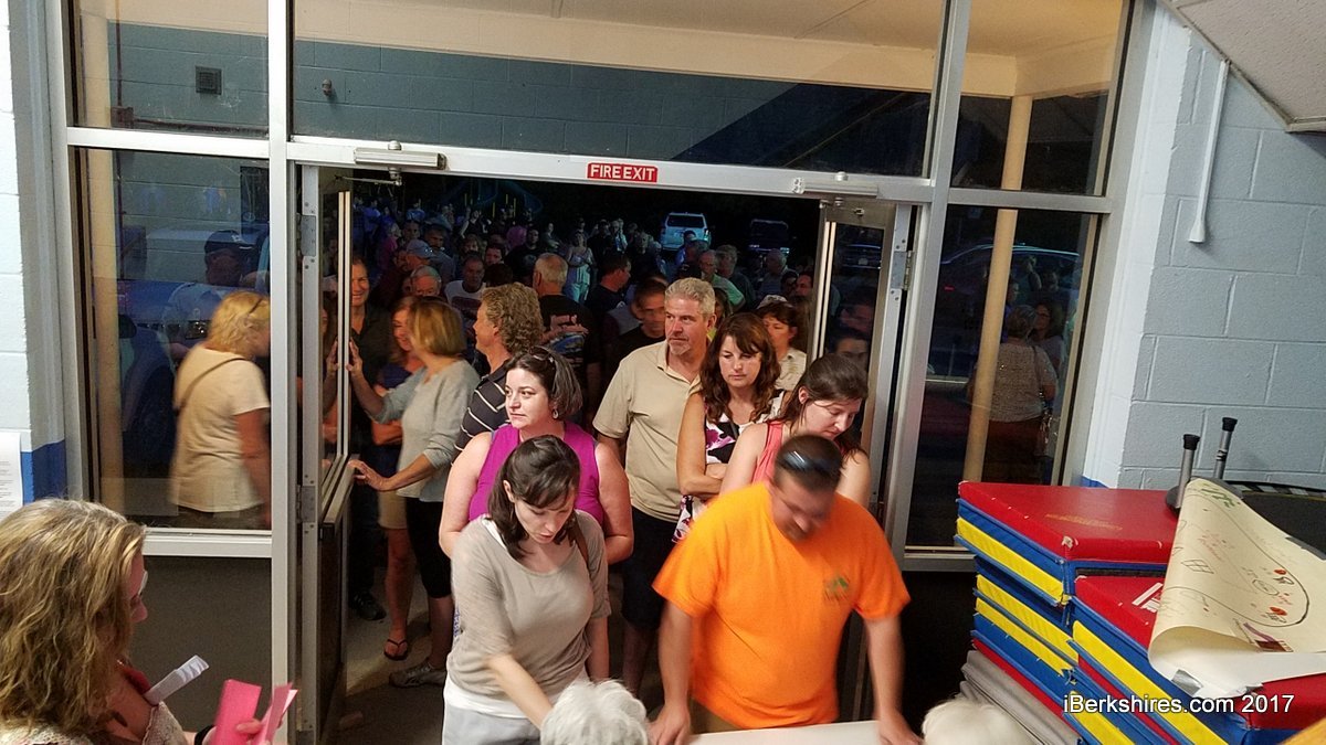 The special town meeting brought out a record-breaking crowd of 453, making it the largest in memory. The line to get into the school stretched from the back of the school up the driveway; vehicles were crowded into every available spot along West Cross Road and at the Senior Center several hundred yards away.