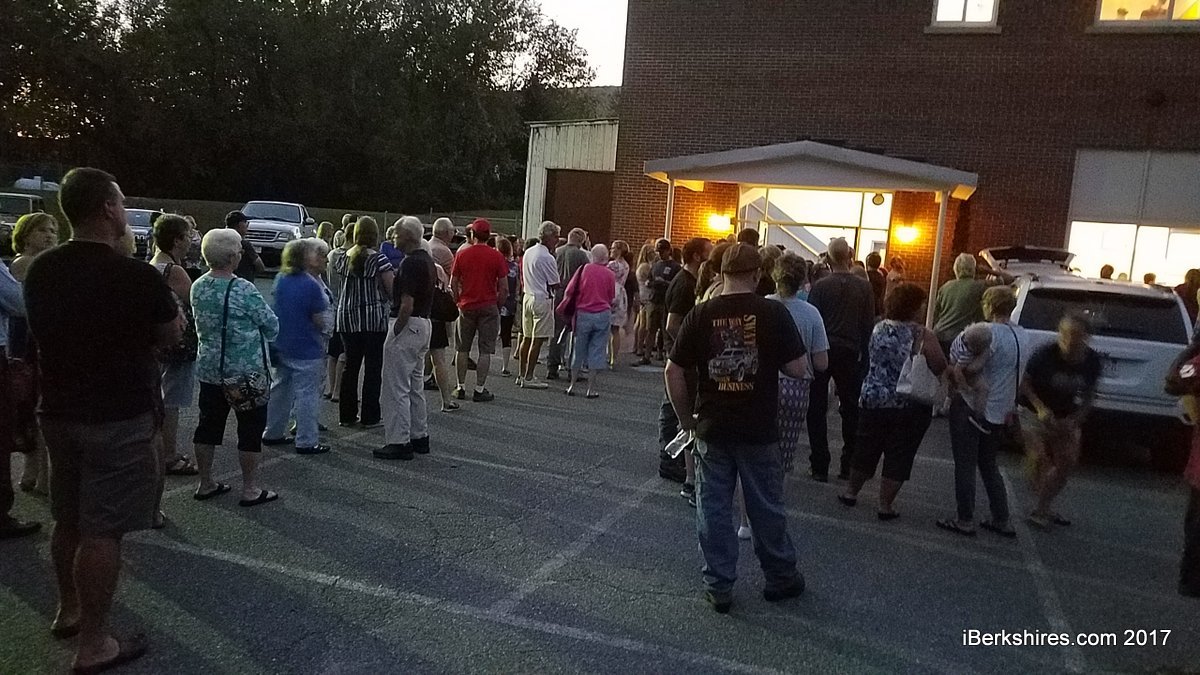The start of the meeting was delayed an hour as voters signed into the standing-room only gym, the largest gathering place in the town. Well more than 100 stood outside by the open windows as a PA system tried to relay the action on the floor.