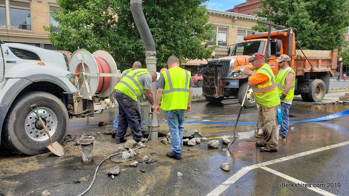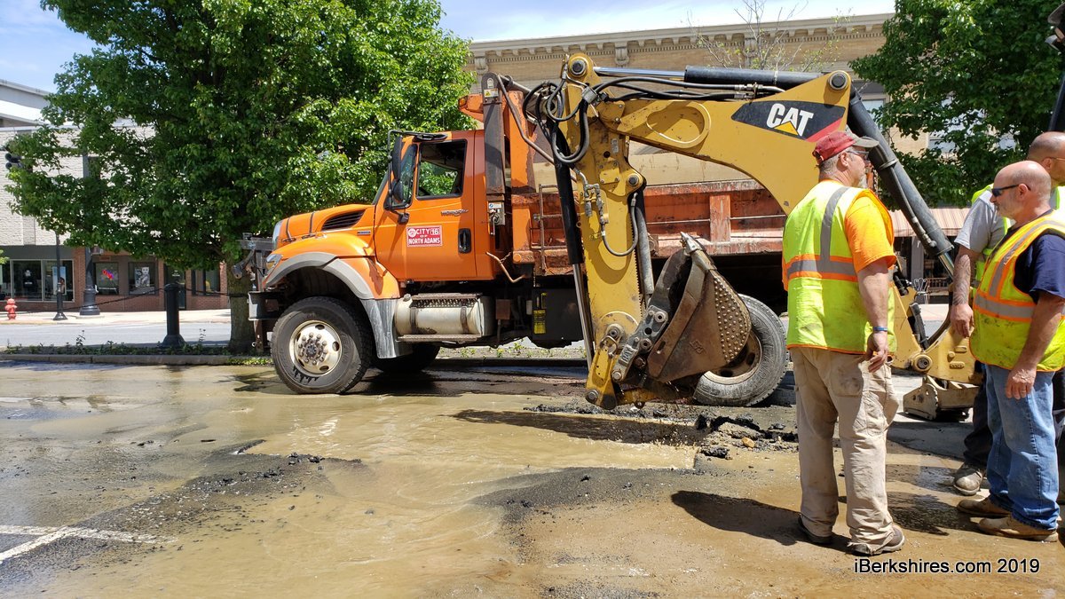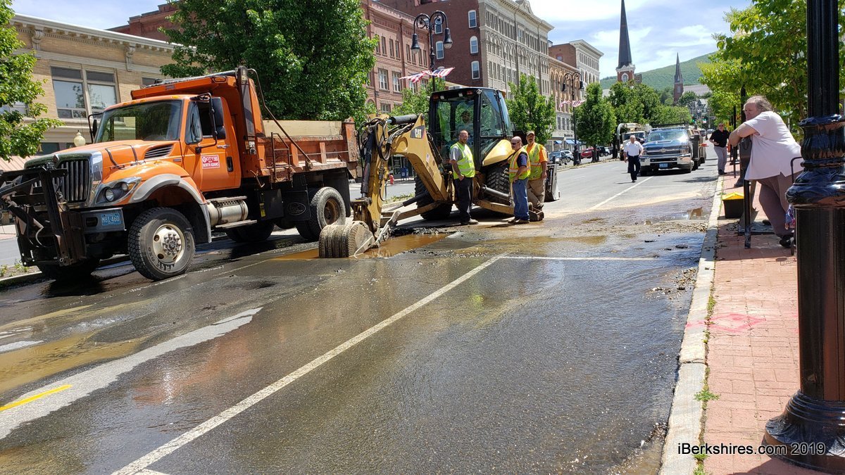 Water had to be turned off for one section Main Street (iBerkshires' and the bank) on Monday afternoon but we and others affected by the loss of water should see it return shortly. The road will continue to be closed at least until evening; the BRTA is picking up passengers at the entrance to the former K-mart parking lot on Main Street.