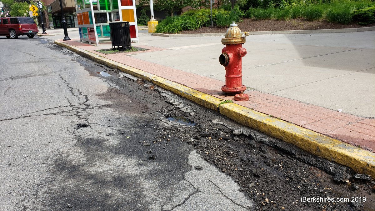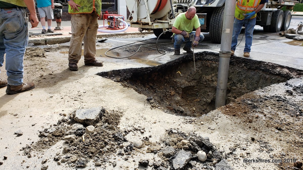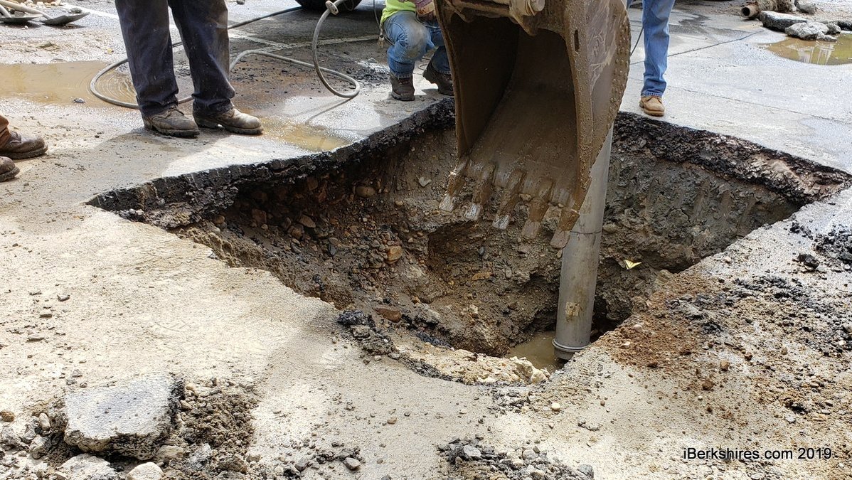 Water saturated a good part of Main Street and undermined several areas during the six hours or so before it could be diverted. Once the pipe is repaired, the pavement will have to pulled up on the eastbound section in front of the L-shaped mall and along the sidewalk all the way up to the iBerkshires offices.