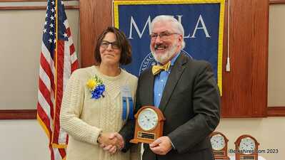 | | Lindsay St. Pierre McGinnis is presented the Outstanding Educator Award in 2023 by MCLA President Jamie Birge. |