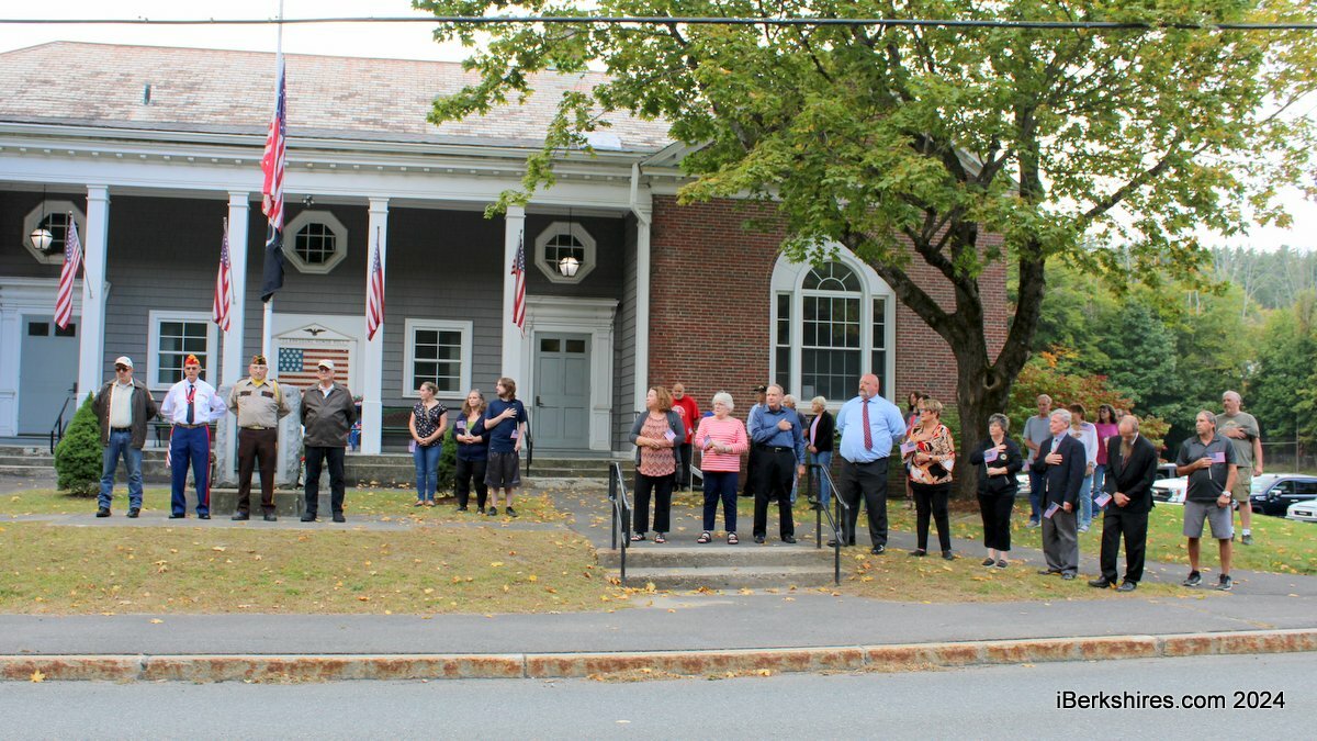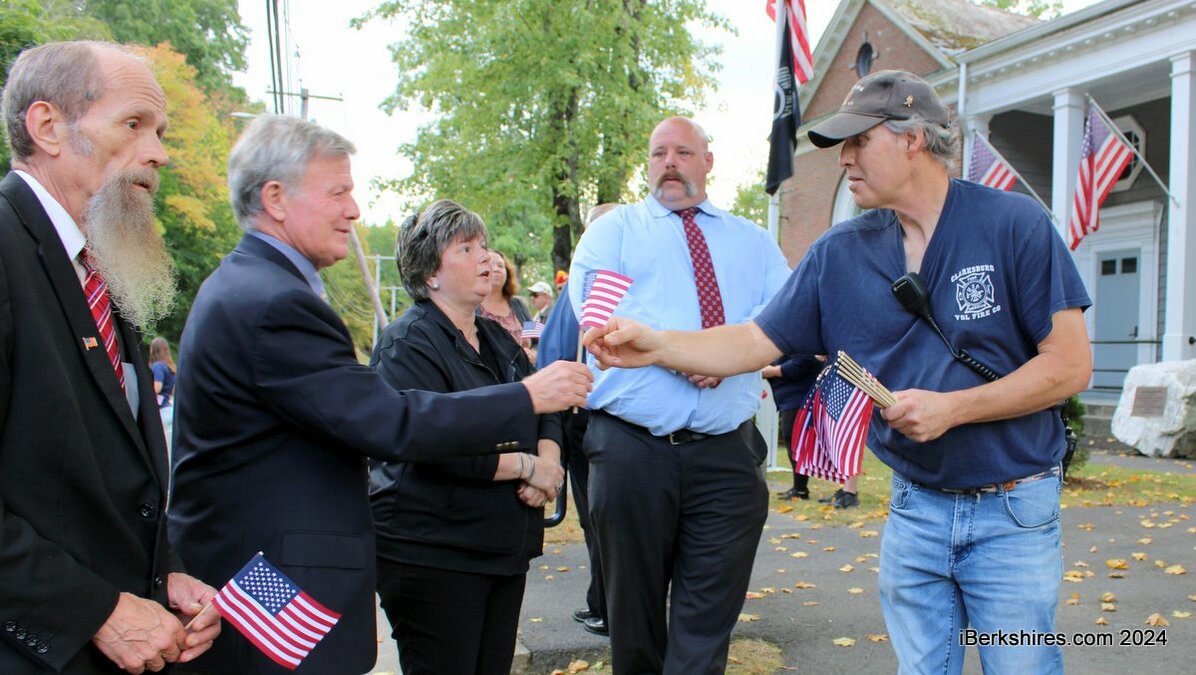 Pruden and Clarke arrived with the procession Friday afternoon and Pruden laid a wreath at the memorial stone at Town Hall. The VFW's Joseph Bushika offered words of remembrance.