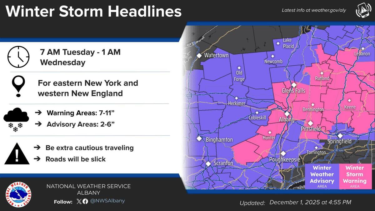The National Weather Service in Albany, N.Y., has issued a winter storm warning starting at 7 a.m. on Tuesday with nearly a foot of snow forecast to fall through the day. The warning covers the Berkshires, Southern Vermont and parts of eastern New York State.