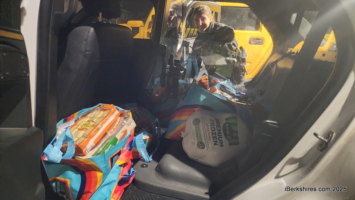 On the Tuesday before Thanksgiving, an assembly line was set up in the Armory basement to pack bags of sides to go with 20-pound turkeys. Police cruisers drove in to pick the dinners and deliver them to local residents.