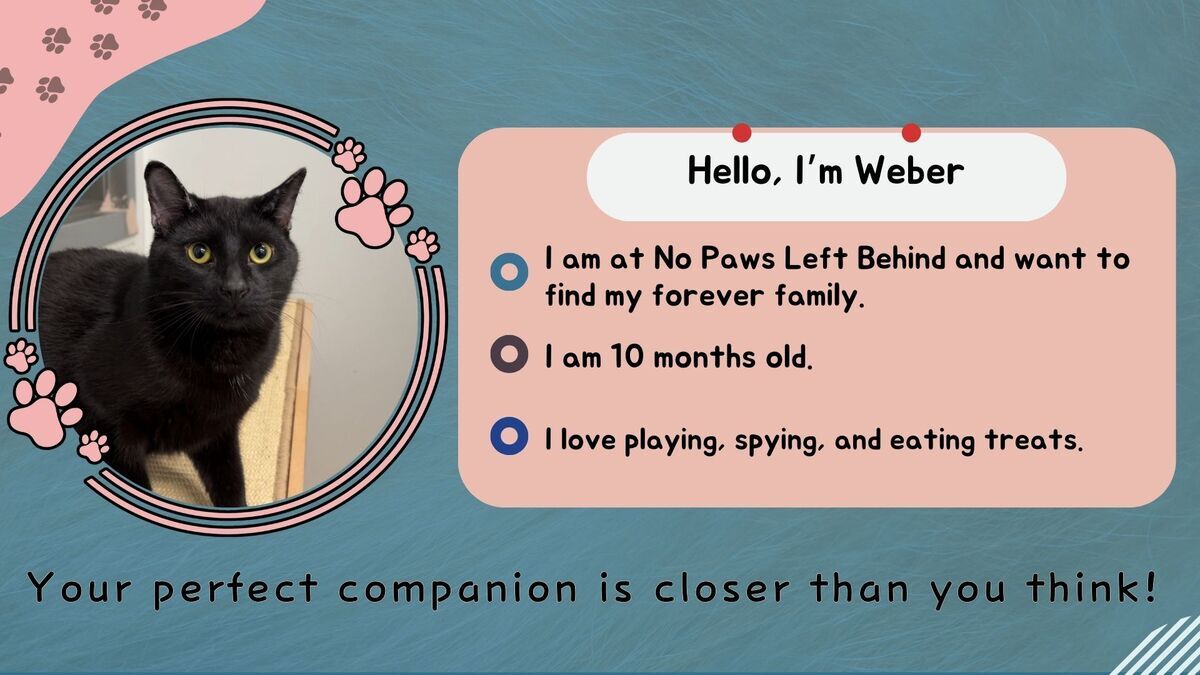 Weber is a 10-month-old domestic shorthair. He has been at No Paws Left Behind since November.